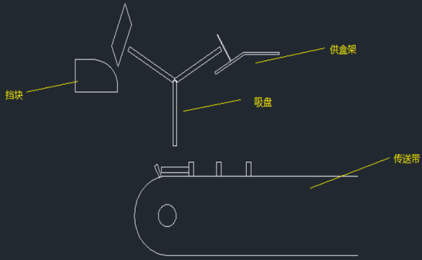 該紙盒撐開機構(gòu)的過程是:吸盤逆時針旋轉(zhuǎn)(約30°)到供盒架處,吸住紙盒的一側(cè),將其從供盒架吸出;之后吸盤帶著紙盒繼續(xù)旋轉(zhuǎn)120°,紙盒的側(cè)面碰到擋塊,在擋塊的擠壓作用下,紙盒順勢滑下,從而處于半撐開狀態(tài)。最后當吸頭轉(zhuǎn)到傳送帶的正上方,真空吸頭通氣,釋放紙盒到傳送帶的卡槽中,運動中卡槽的一側(cè)將紙盒向前擠壓,使紙盒處于完全撐開狀,供后面裝入食品使用,這樣就完成了整個取盒動作。